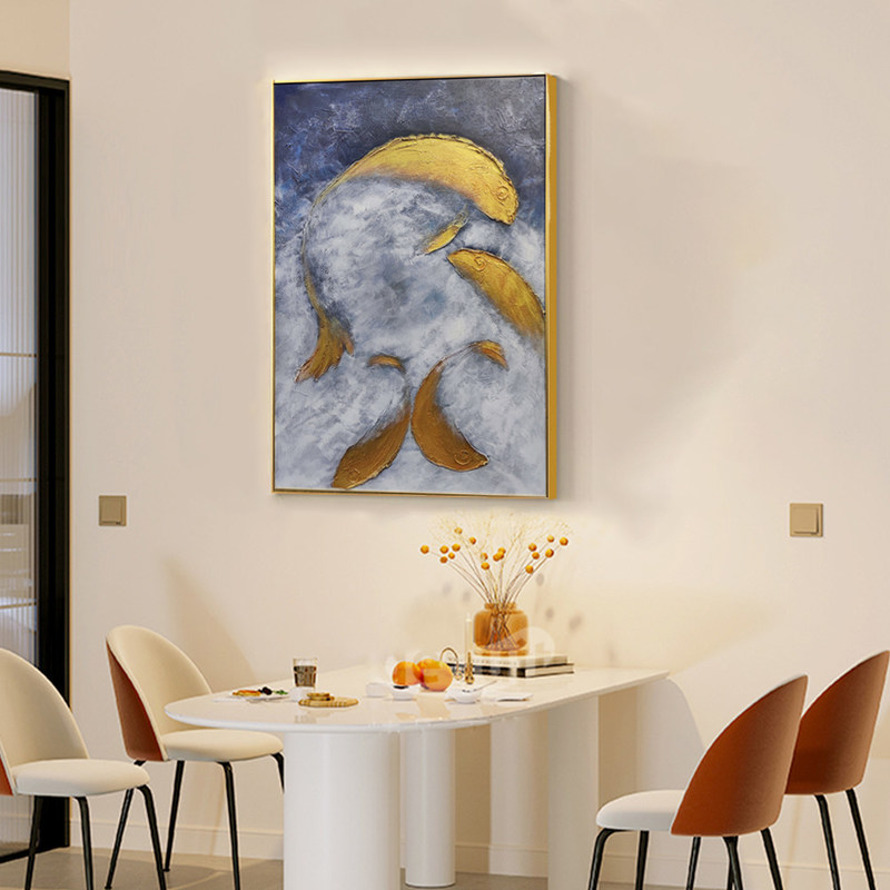 نقاشی روغن متوسط و روش چاپ 6 رنگی استفاده شده برای نقاشی دستی ماهی های طلایی هنر ورق طلا هنر اتاق نشیمن 0